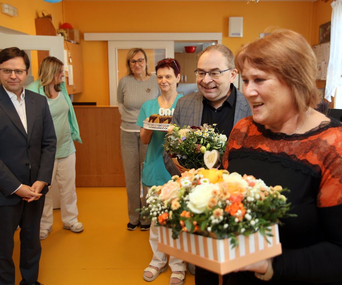 K významnému životnímu jubileu jí přišli popřát zaměstnanci domova i zástupci města. Osobně gratulovali starosta Petr Hájek a místostarosta Jiří Preclík. Nechyběla květinová výzdoba ani slavnostní dort se symbolickou stovkou. Setkání proběhlo v příjemné a srdečné atmosféře za účasti dalších obyvatel domova.