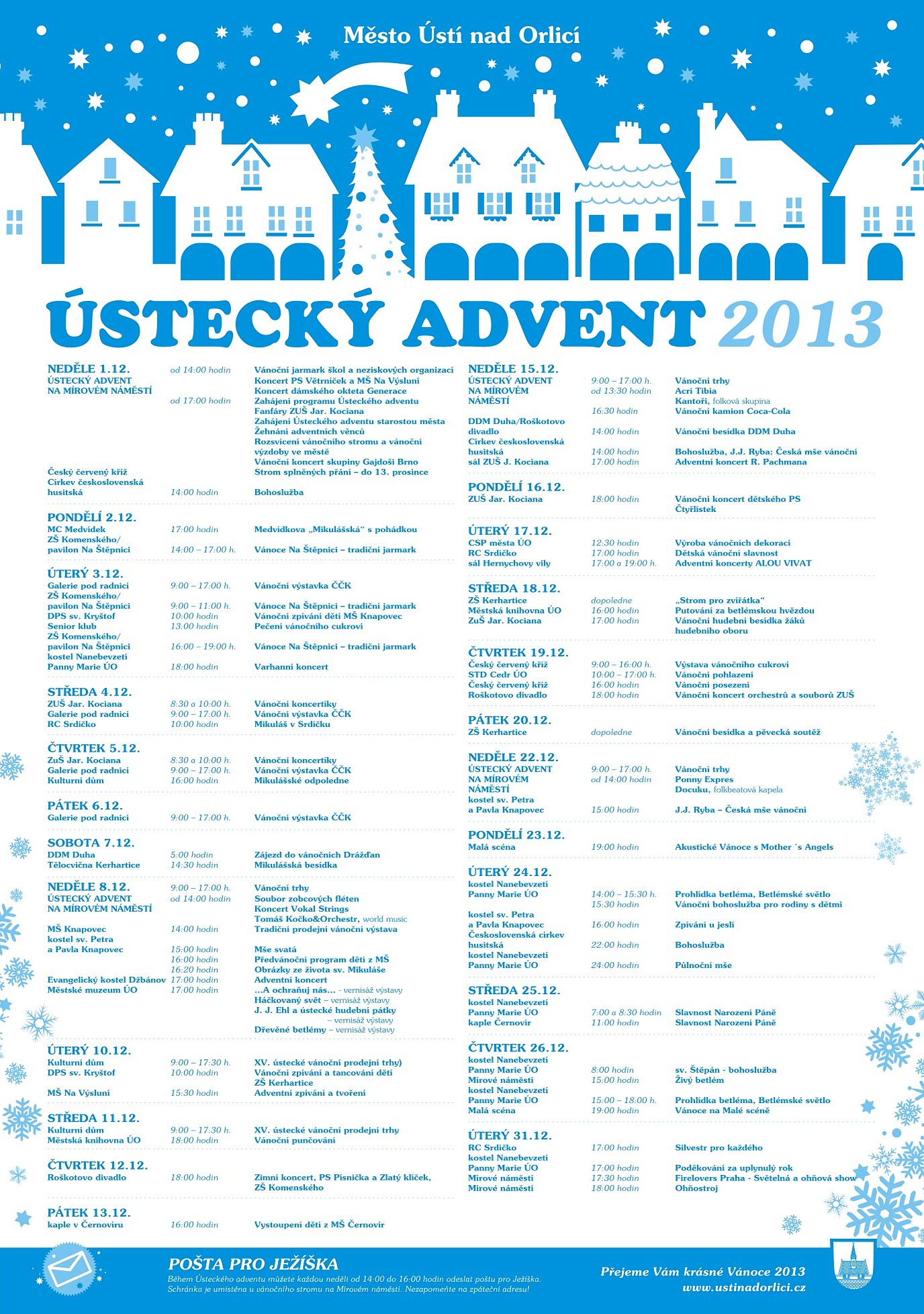 Umístěn program akce ÚSTECKÝ ADVENT 2013. Začínáme v neděli 1. prosince na Mírovém náměstí vánočním jarmarkem, rozsvícením stromu a bohatým doprovodným programem, který je pro vás připravem každou adventní neděli od 14 hodin.V nedělních dopoledních hodinách budou na Mírovém náměstí probíhat trhy s vánočním zbožím. Po celou dobu trhů a kulturního programu je pro vás připraveno občerstvení. V neděli 15. 12. zavítá do našeho města Coca Cola - Vánoční kamion se svým programem a soutěžemi pro děti.Nově se letos budeme loučit se starým rokem. Poslední den v roce ozáří centrum města ohňová show a ohňostroj. Přijďte se rozloučit se starým rokem o silvestrovkém podvečeru na Mírové náměstí.